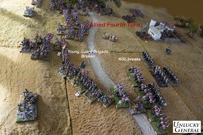 Taking the initiative, the allied cavalry sent in all four squadrons of the 4th Dragoons in mutual support together with the two remaining KGL squadrons. Then the infantry poured close range fire into the supporting, rear most Young Guard Battalion, shaking it and thus breaking the Young Guard Brigade (one routed, one shaken out of three breaks the brigade).